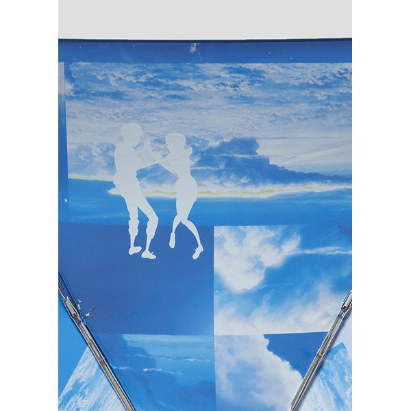 映画『天気の子』より。天候の調和が狂っていく時代。離島から東京にやってきた家出少年・帆高と不思議な力を持つ少女・陽菜が自らの生き方を「選択」する、美しく切ない物語。晴れた空のコラージュと、帆高と陽菜のシルエットを配置しました。雨の日でも見上げると晴天が広がる気分の上がるデザインです。